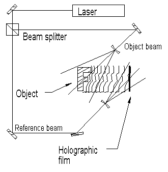 Recording an off-axis hologram. Coherent light from a laser is split into two beams of approximately equal path length. One, the reference beam, falls directly on to the recording medium. The other beam, which may be further split into many beams, illuminates the object. The hologram records the interference pattern between the light reflected, scattered, or diffracted from the object and the reference beam.