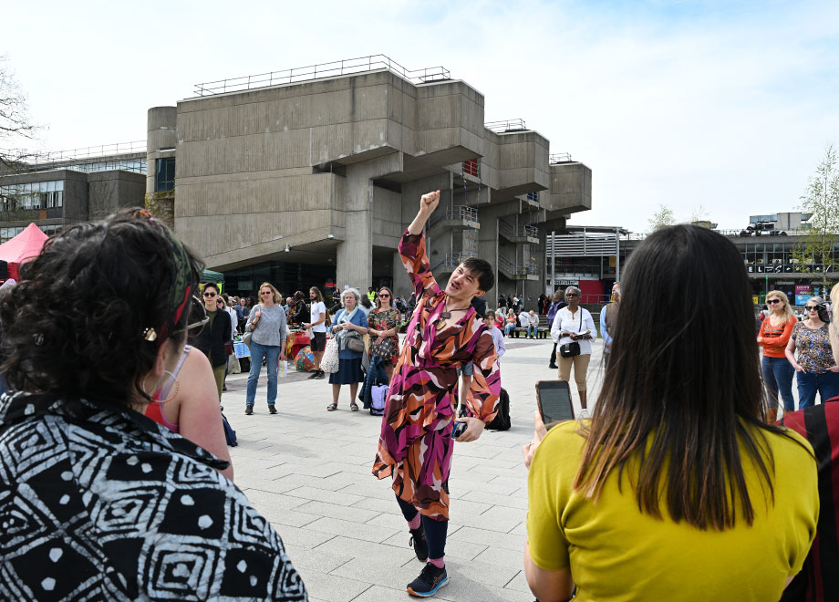 Soaking up the atmosphere in Benjamin Zephaniah Square at the heart of Brunel’s campus