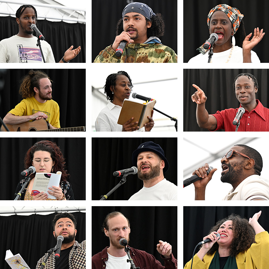 Twelve of the poets, writers and musicians who took to the stage at Benjamin Zephaniah Day, including those from the Black Writer’s Guild, WritersMosaic, Apples and Snakes, and Rebels and Pilgrims
