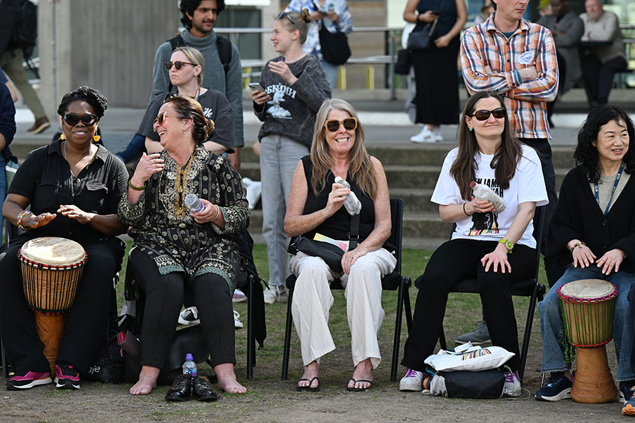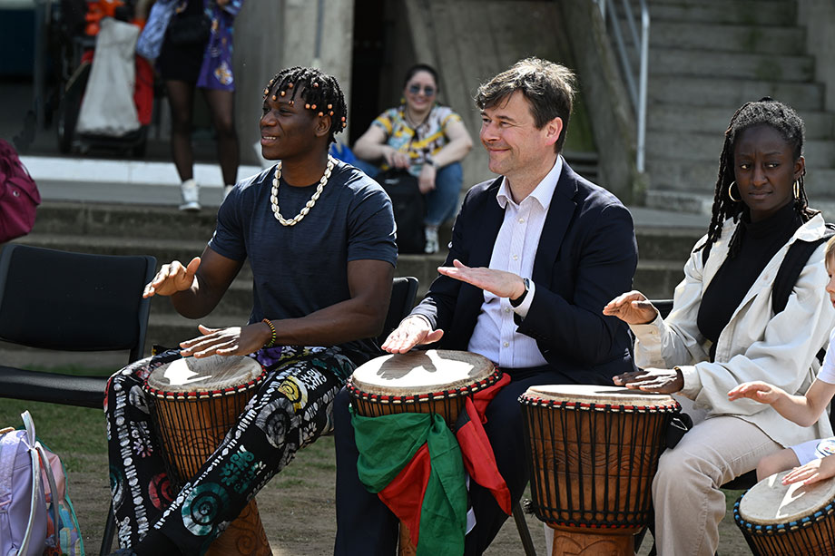 Prof Andrew Jones, Brunel’s Vice-Chancellor and President, during a drumming workshop