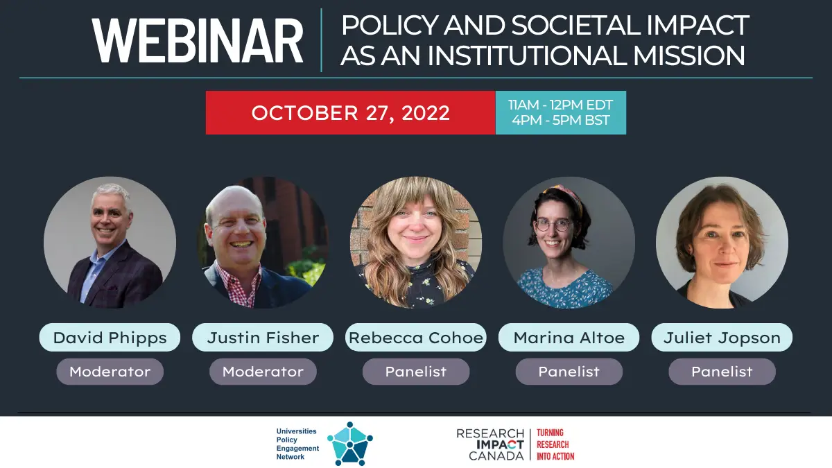 Join the second webinar jointly organized by Research Impact Canada (RIC) and Universities Policy Engagement Network (UPEN)! The webinar will be hosted by Justin Fisher (Brunel University & UPEN) and David Phipps (York University & RIC).