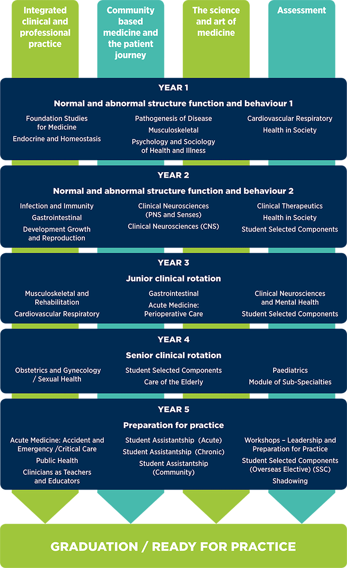 - Clinical Practice and Community CareIncludes the following components: Clinical Skills Clinical Communication Clinical Placements Medical Humanities