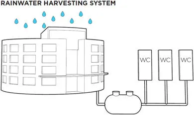 A rainwater harvesting system collects water from roof areas, which is then stored within the building and used to supply sanitary fittings.