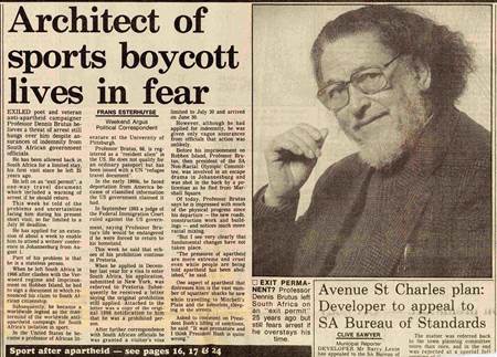 Born 1927 in Rhodesia [Zimbabwe], Brutus grew up in Doverville, Port Elizabeth, South Africa. He graduated from Fort Hare and taught for ten years in a government high school in Port Elizabeth, but was eventually dismissed for his vocal criticism of apartheid. He was also involved in the "coloured" [sic] Convention Movement. In 1958 he founded the South African Sports Association (SASA) whose essential aim was the elimination of racism in South African sport, and which worked to suspend international recognition of any sports associations which refused to condemn racism. SASA's major achievements were the suspension of the Football Association of South Africa and the international recognition of the non-racial Table Tennis Board in place of the S.A. Table Tennis Union. In 1962 a parallel organisation was started to persuade the International Olympic Committee to act against the South African Olympic Committee. The South African Non-Racial Olympic Committee (SAN-ROC), with Dennis Brutus as its president, had considerable success, not only with the exclusion of South Africa from the Olympic Games of 1968, but also with the withdrawal in 1976 of many African competitors from the Montreal Olympics as a consequence of New Zealand's refusal to stop its rugby team from playing against that of South Africa.