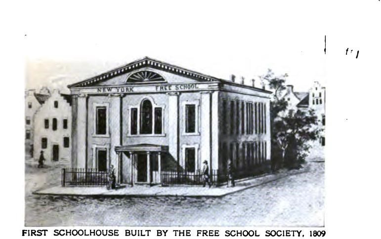 In the early nineteenth century the city of New York had a population of c. 75 000, constantly being increased by immigration. The social conditions bore a strong similarity to those in Southwark, London, where Lancaster had opened his first school. Education was largely provided by private, church and charity schools. The poorest children were generally not provided for. Some philanthropic residents, including the Governor of New York, DeWitt Clinton, believed that limiting education to the children of gentlemen was “a danger to society”, made more acute by the rapid growth of the city. In 1805 this group formed the New York Free School Society to establish schools open to all at no charge. Its first president was DeWitt Clinton.
