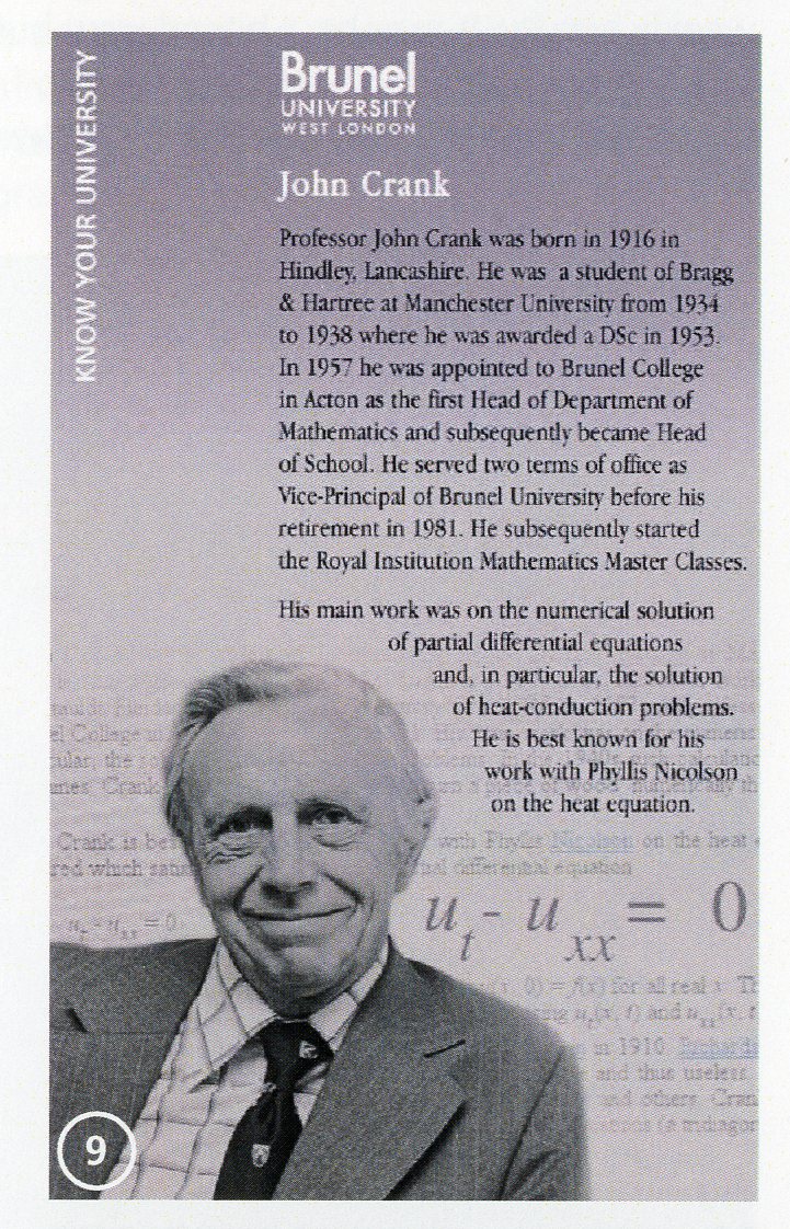 In 1987, as part of a process of renaming University buildings to honour leading figures in the history of both the University and the wider academic world, the Mathematics Building was renamed the John Crank Building, after Professor John Crank, the first Head of the Department and subsequently Head of the School of Mathematical Studies.