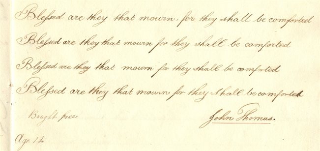 Handwriting of John Thomas, aged 14, “Bought free”.