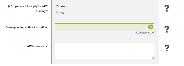 Answer Yes to the question: Do you want to apply for APC funding? You must also complete the pre-submission funding request form.
