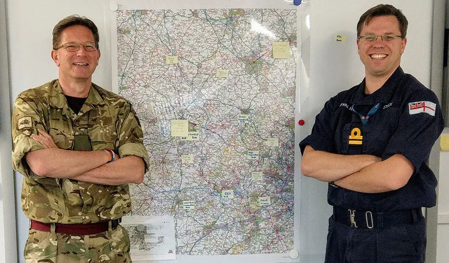 Major Mike Keighley, Army Reservist and Brunel’s Director of College Operations for the College of Health and Life Sciences (CHLS), and Lieutenant Chris Stock, Royal Navy Reserve Officer and Brunel's College Services Manager for CHLS, were both deployed back in March to serve with the Joint Military Command based in the South East (JMC-SE).