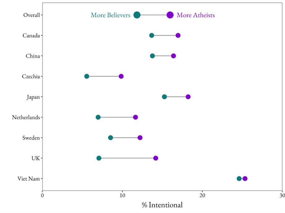 Overall, our participants’ odds of rating the religious outcome as intentionally caused were about 40% higher when the news story created more atheists, as opposed to more believers. This effect persisted across most countries in our sample, and was even evident among participants who were themselves atheists.
