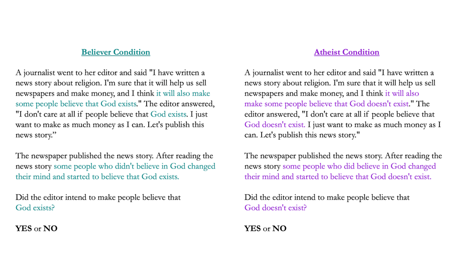We presented participants with a modified Knobe effect vignette in which a journalist publishes a story that sells a lot of papers. The story either leads to more atheism in the world, or to more religious faith. Crucially, we asked our participants to rate whether the ensuing religious shifts were intentionally caused by the journalist.