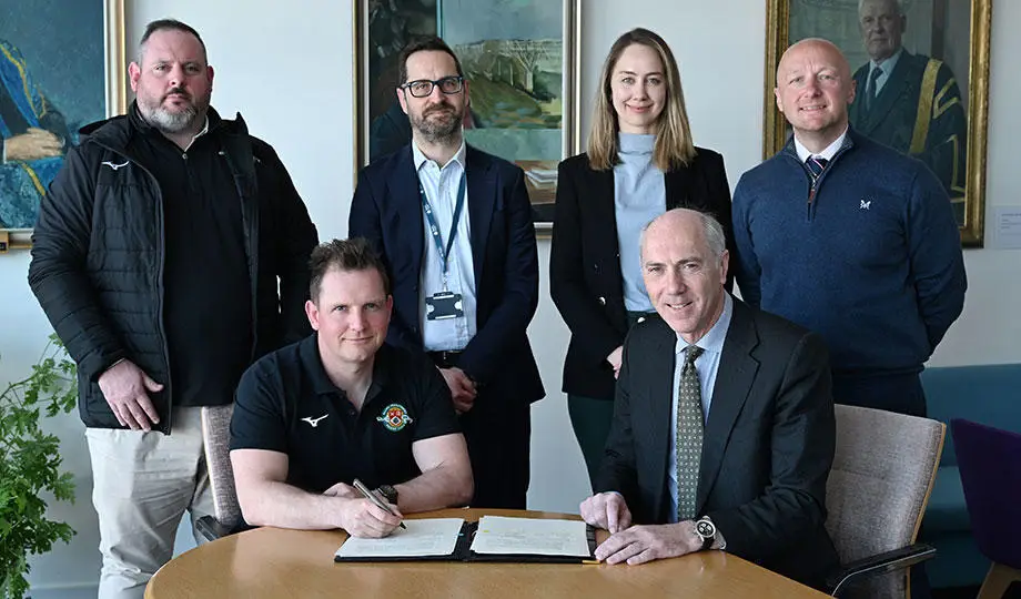 Signing the 10-year renewal agreement. Seated, left to right: Ben Ward (Director of Rugby and Managing Director, Ealing Trailfinders) and Professor Jonathan Wastling (Deputy Vice-Chancellor, Brunel). Standing, left to right: Gareth Rise, Academy Manager, Ealing Trailfinders), Dr Manuel Alonso (Chief Operating Officer, Brunel), Kirsty Smith (Associate Director of Global Engagement, Brunel) and James Budkiewicz (Deputy Director of Commercial Services, Brunel).