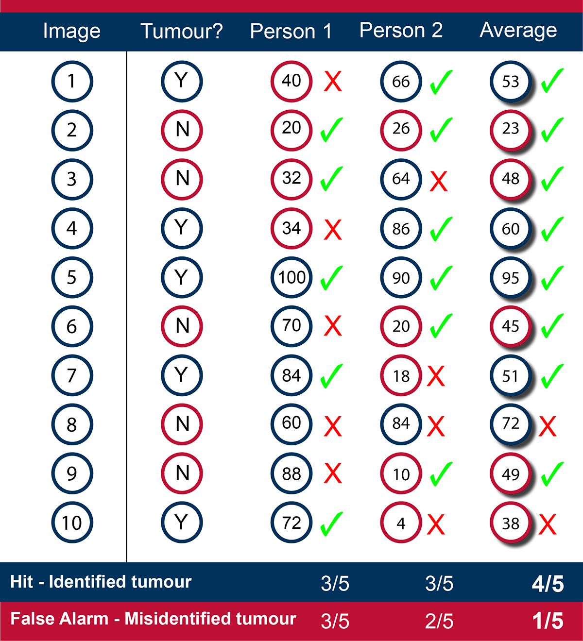 The researchers discovered that by averaging both peoples’ scores before rounding up or down, you significantly increase your chance of correctly identifying the tumour.