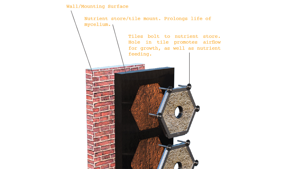 Newly unveiled as a prototype, Myco-Hex tiles use tongue and groove to click together. They are cheap to make, sound-proof, fire-retardant and can mount mostly anywhere outdoors, such as billboard hoardings or in school playgrounds. Besides sawdust, the mycelium could be fed food waste such as coffee grounds to keep them growing healthily.