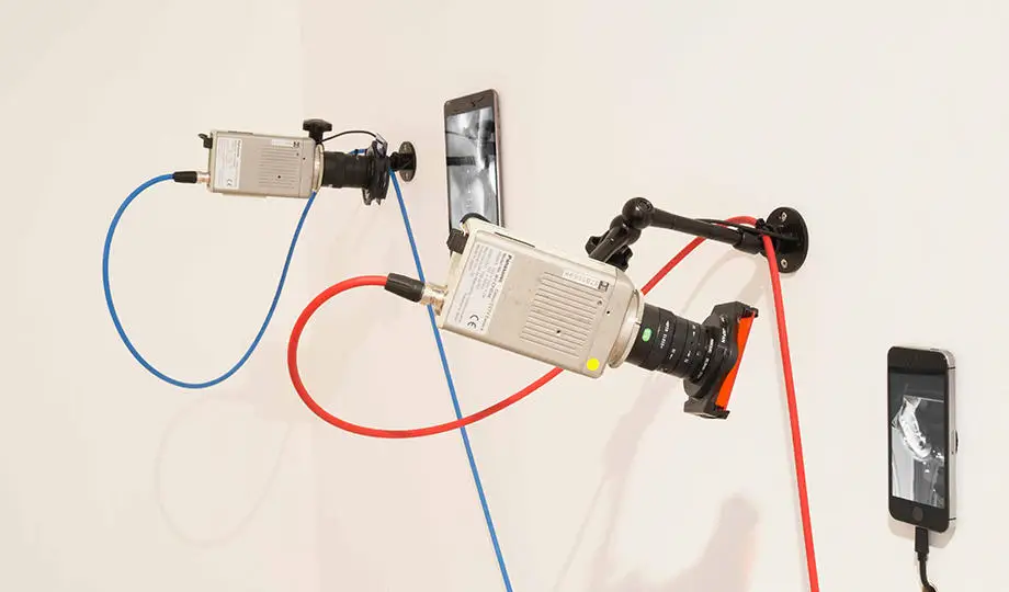 “The installation allows the technology to play into its self, and force a direct link between closed circuit television, and the networked technology that we all use – the work appears like a physical diagram of self-surveillance,” said Coy.