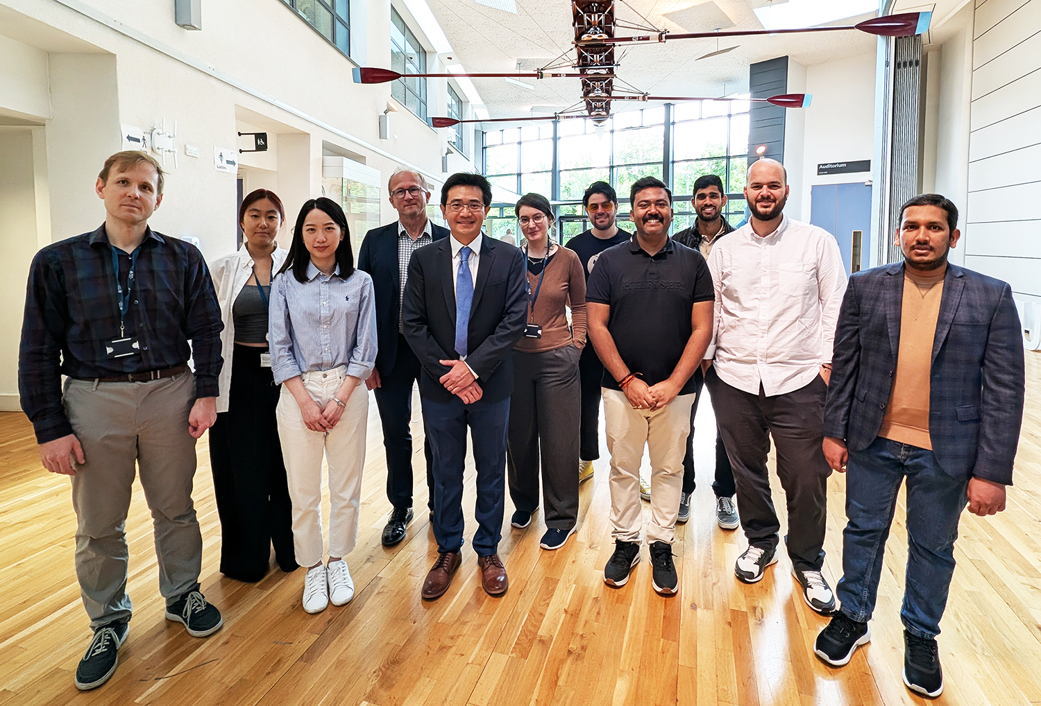Photo of Additive Manufacturing and 4D Printing Research Group (from left to right) - Pawel Jurkiewicz (Doctoral Researcher); Jiaya Qin (Doctoral Researcher); Dr Amber Wang (Postdoc); Chris Biggadike (Doctoral Researcher); Prof Eujin Pei (Group Leader); Angeliki Martinou (Research Coordinator); Anto Torone (Graphic Design Intern); Dr Anand Mohan (Postdoc); Janith Gooneratne (Research Coordinator); Dr Theodoros Marinopoulos (Postdoc); Dr Azeem Uddin Azeem Islam (Postdoc). Not shown: Jessie Lei (Doctoral Researcher); Jinghao Bai (Doctoral Researcher); Montida Lertnimanoradee (Doctoral Researcher); and Jawad Jawad (Programming intern). Photo taken in June 2025 at Eastern Gateway Building, Brunel University.