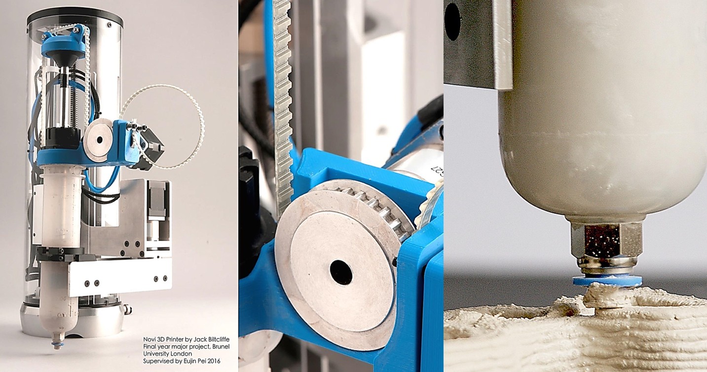 Above: Jack Biltcliffe's Major Project was to build a 3D Printer fully capable of forming objects using Portland Stone material. The fully working electro-mechanical prototype was built from scratch. Time was spent to understand the material rheology and to develop the mechatronics of the system. This was a collaborative project with the Portland Stone Quarry and A-Studio. Jack graduated in 2016. First supervisor: Eujin Pei