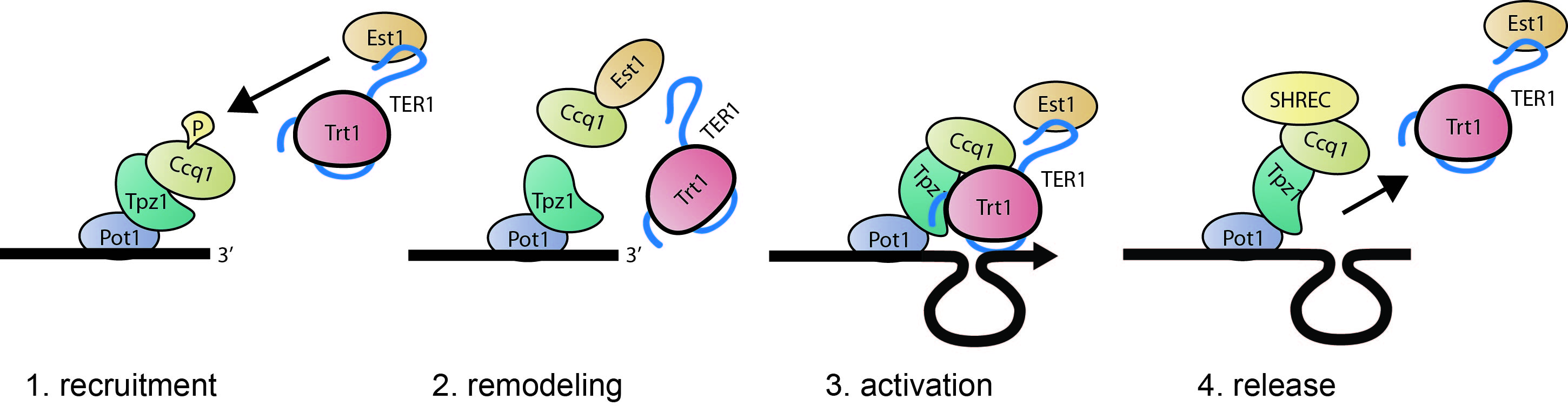 Figure 3 - Model for telomerase interaction and activation - Dynamic interactions of the telomeric protein complex (Pot1-Tpz1-Ccq1) with telomerase (Trt1-TER1-Est1).1) A telomere with marked Ccq1 becomes a target of the telomerase subunit Est1. 2) Interaction of Est1 with Ccq1 releases Ccq1 and Est1 from the telomere and telomerase, respectively. 3) Interaction of Tpz1 with telomerase and re-association of Ccq1 are required for telomere maintenance.4) SHREC-bound Ccq1 promotes release of telomerase from the telomere