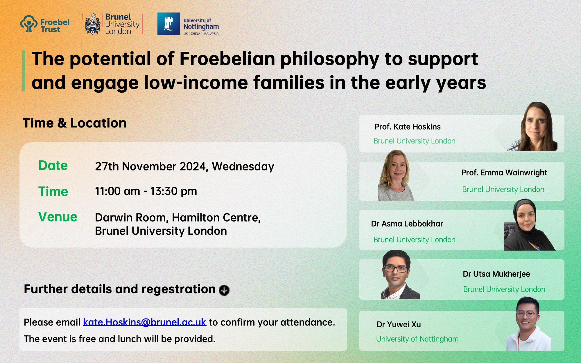 This event will be held on the 27th November from 11:-13:30 in the Darwin Room, Hamilton Centre and is part of on-going work by several of our wonderful Education colleagues working with families with annual income of less than £10,000. To register please email Professor Kate Hoskins: kate.hoskins@brunel.ac.uk.