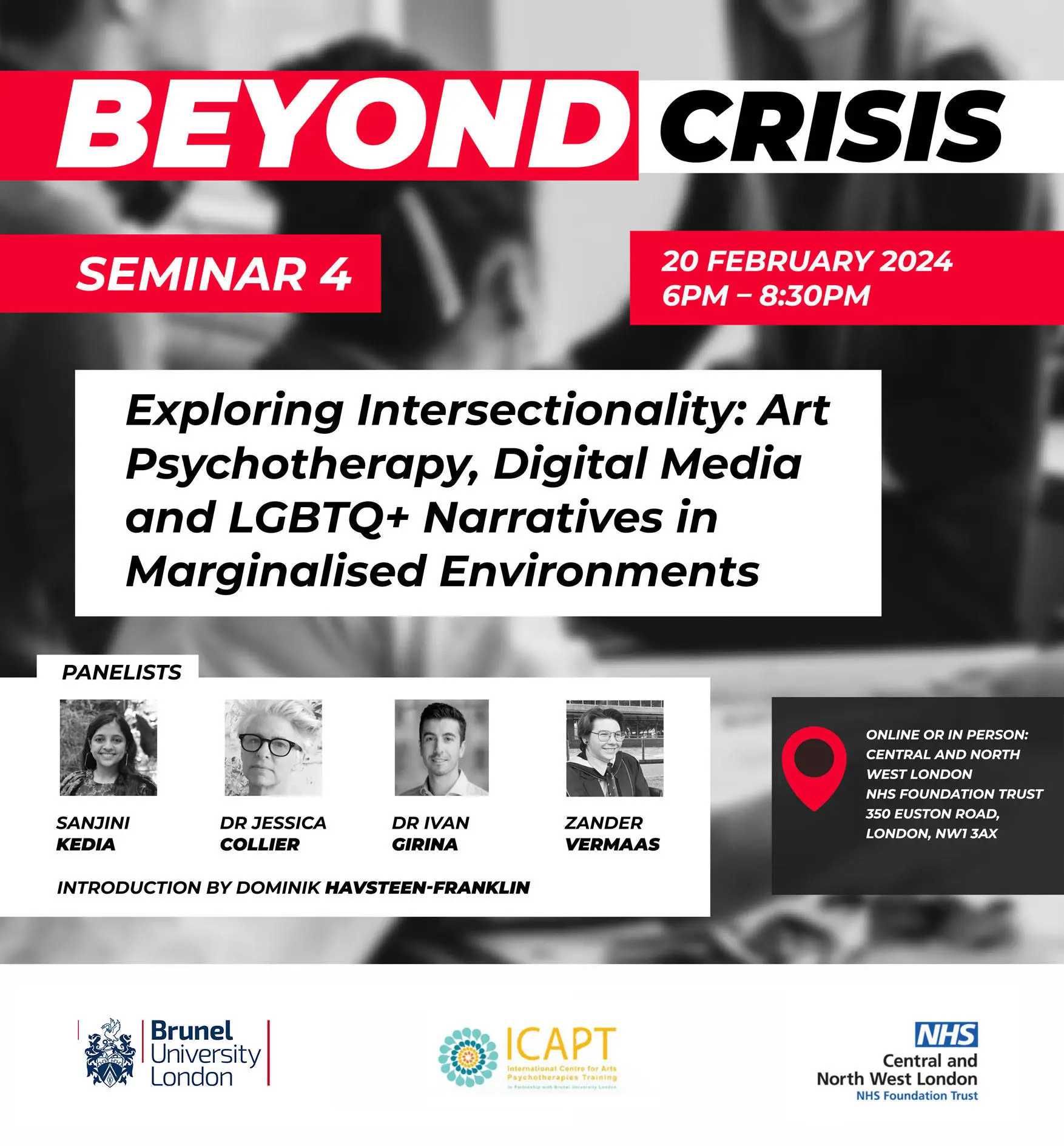 Join the forthcoming "Beyond Crisis" seminar: Exploring Intersectionality: Art Psychotherapy, Digital Media, and LGBTQ+ Narratives in Marginalised Environments. Building on the recent seminar that explored the domains of traditional music therapy models as well as digital wellbeing practices (see more here), the upcoming 4th Seminar takes us on a journey to explore the entanglements of social environments, places, and events where therapeutic practices can make a significant impact. The primary focus will be on the margins of society and the construction of spaces that often delineate distinct social languages and interactions for LGBTQ+ individuals.