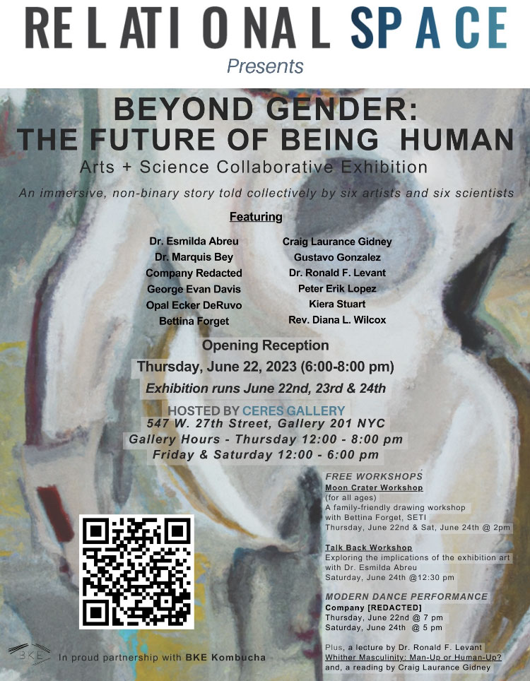 Beyond Gender: The Future of Being Human, a contemporary Art-Science exhibition curated and facilitated by the inspirational Relational Space Gallery/Forum, brought together twelve international artists, scientists, activists, and spiritual leaders to exchange talents and expertise while telling a non-binary story. Beyond Gender empathically reflects upon the impact of rigid gender roles on individuals and society, expressing a future where we are able to move beyond power structures and imposed social restrictions. The exhibit included visual art, dance performance, community workshops, and visitor participation to collectively and actively explore gender and fluidity.