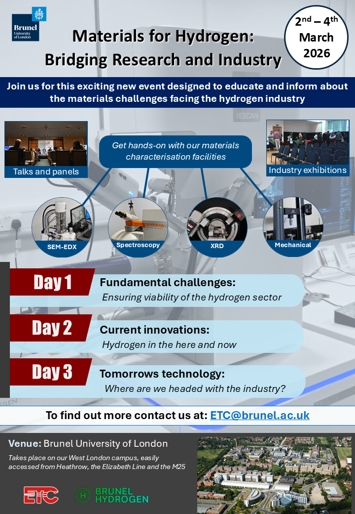 Join us for what promises to be a fascinating three days exploring advances in materials characterisation across the hydrogen sector. For more information and to register interest in the event please contact wayne.lam@brunel.ac.uk