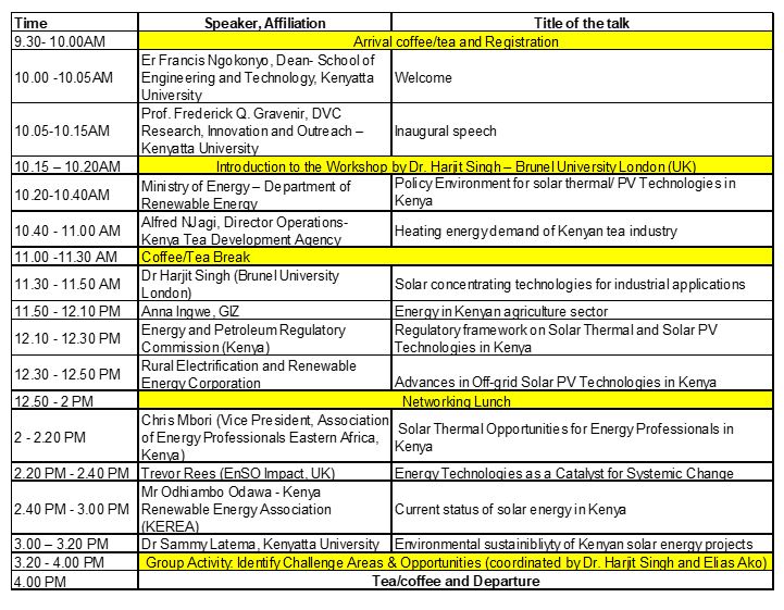 In this context, this seminaraims to initiate a dialogue among academic scientists, industry professionals, NGOs and policy makers to identify barriers and opportunities for innovative solar energy technology uptake in Kenya. Through the seminar, intention would be to map energy deficit end-users (buildings, industries) in rural and/or urban areas and understand energy demand and its characteristics for at least one major end user. Solar technologies able to match this energy demand profile and their economics will be discussed and an assessment of the expected socio-enviro-economic impacts performed assuming realistic deployment scenarios.