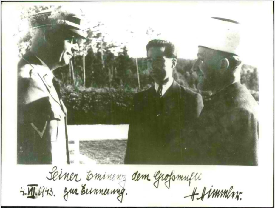 Left to right: Heinrich Himmler, head of the SS, with unknown and Amin al-Husseini, 4 July 1943. Credit – Israeli State Archives, Eichmann Papers. A/3149/16.