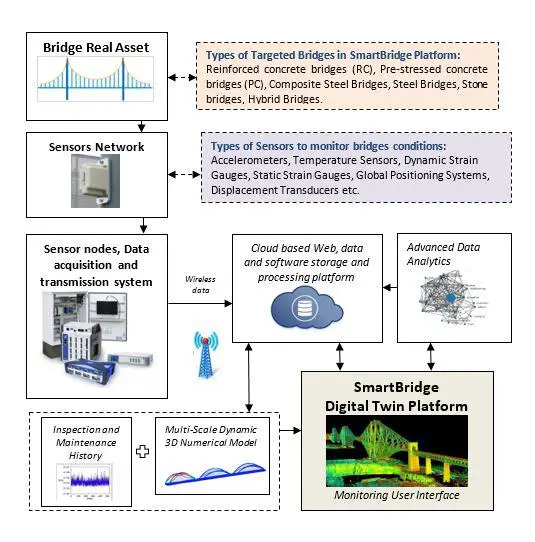 The SmartBridge platform will allow bridge operators to do lifecycle and behaviour analysis of a bridges degradation considering the application of structural health monitoring (SHM) systems to perform a controlled lifetime extension of the bridges with known problems has greatly increased in recent years. SmartBridge will continuously forecast and update information on health, condition, reliability and remaining life of infrastructures/ bridges enabling new and enhanced levels of safety and reliability without overdesigning infrastructure. SmartBridge will enhance competitiveness and productivity of partners involved by generating in 5 years post commercialisation; £81million in revenue, £36 million in gross profits and 367 skilled jobs.