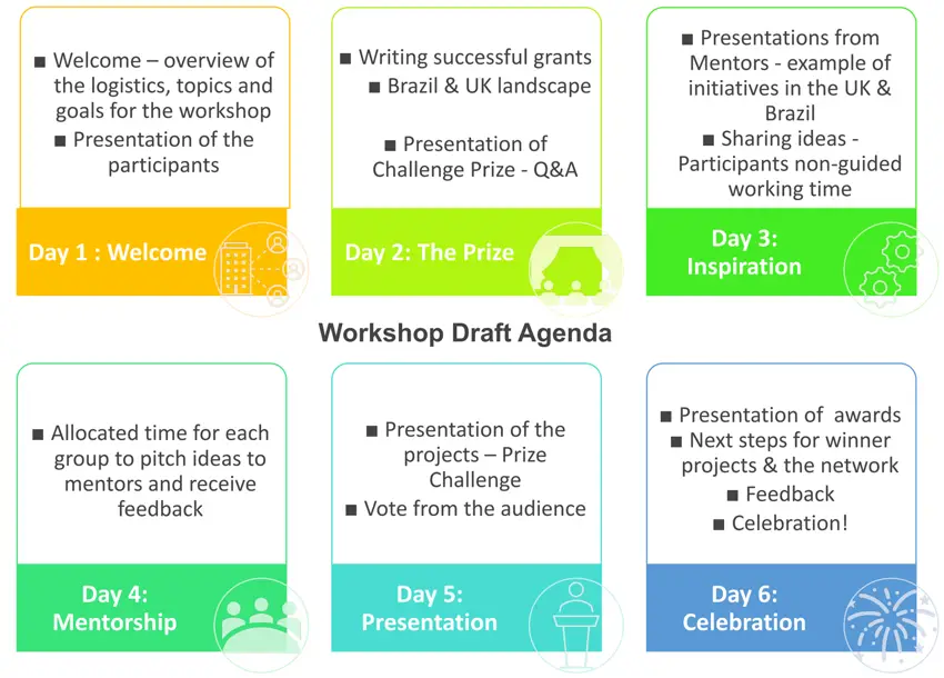 The workshop will have a “Prize Challenge”, which consists of up to £35000 fund to enable the development of 5 projects (or more depending on costs) created during the workshop between UK and Brazil participants. Each project may request up to £7000. More guidelines will be given on due time.