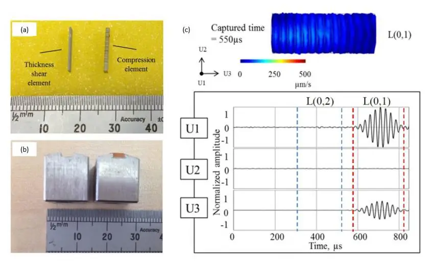 Developed novel high resolution transducer (a) thickness of the PZT elements (b) bespoke transducer and (c) 3D-LDV experimental results of waveform generated by novel transducers.