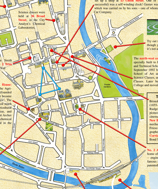 Scientific Heritage TrailsThese full colour A2 poster/guides celebrate the scientists and engineers who lived and worked on Bath. This developed into a major project, with interest from eight UK cities. The Bath map proved to be popular with schools, tourists and residents. For a small fee, copies are available from the Museum of Bath at Work and the Bath Tourist Information Office See a sample section here.