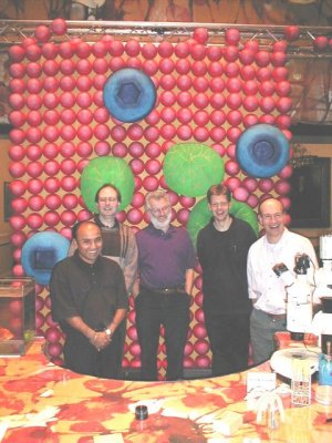 The photo shows: Bipin Parmar (RI), Colin Axon, John Sulston (Sanger Centre), Carlo Masserella and David Dugan (both Windfall Films).