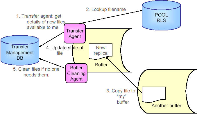 Simple agents are used to distribute the files. Currently the status of this work is that the agents are coded and extensive testing of replication is underway as part of the 2004 Data Challenge.