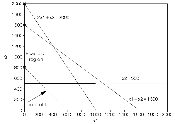 The graphical representation of this LP is shown below and the optimal solution occurs at the intersection of x1 + x2 = 1600 and 2x1 + x2 = 2000 i.e. at x1 = 400, x2 = 1200.