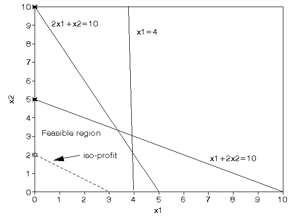 Solving simultaneously, rather than by reading values off the graph, we have that x1=x2=(10/3) with the value of the objective function being (50/3).