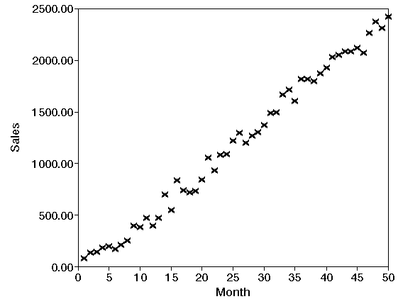 The graph of the data for the J785 sales can be seen below. You will note that there appears to be a linear trend (straight line) to the data and no visible seasonal effect (such as sales always rising in summer and dropping in winter). This illustrates that even simple visual inspection of data can give you useful information.