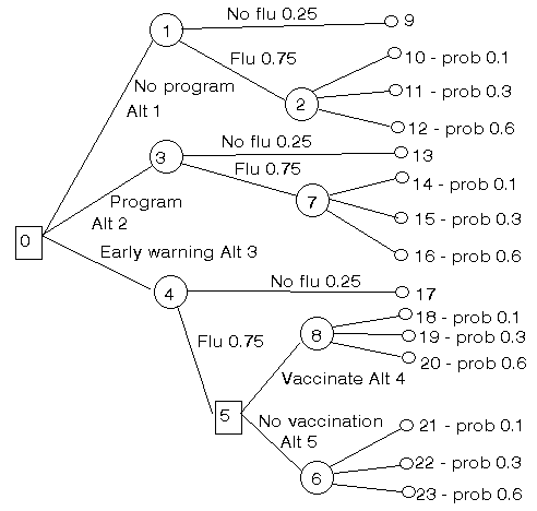 Note here that it is clear that the concept of the vaccination program being an insurance against all possible losses could have enabled us to have drawn a much simpler decision tree (e.g. chance node 3 could be transformed into a "terminal" node of cost -£7m and nodes 7,13,14,15 dropped altogether (similarly for nodes 8,18,19,20)). However, for clarity, we have presented the decision tree as given above.