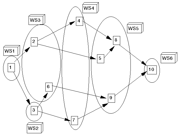 A diagrammatic representation of the work elements involved in the various workstations for the solution shown above is given below. Note here that the order for processing is first workstation 1, involving work element 1; then workstation 2, involving work element 3; then workstation 3, involving work elements 2 and 6; etc.