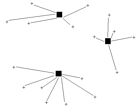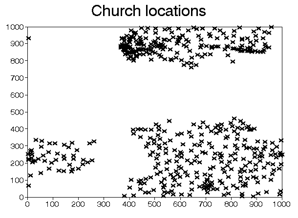 For the purposes of this study a 100 kilometre square to the north-east of London was chosen. An obvious first question is How many churches are there in this area and where are they? Alas the organisation did not seem too sure of the answers to this question. Eventually we consulted maps of the area and came to the conclusion that we thought there were 504 (Church of England) churches in this area. A plot of the location of these churches is shown below (church positions to one-tenth of a kilometre). You can see that they are clustered together in a number of distinct areas.
