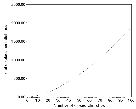 To solve this problem we took a simple interchange heuristic from the literature and coded it. The effect of closing churches in terms displacement distance (measured in people kilometres) is shown below. You can see that as more churches are closed the total displacement distance increases.