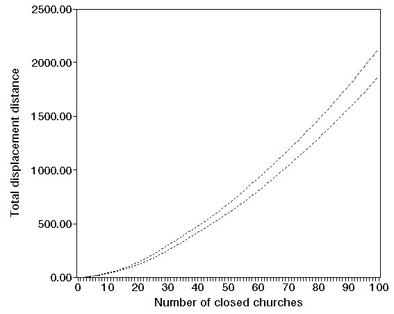 We therefore modified our algorithm to ensure that no churches with a congregation of 50 or more could be closed (i.e. only "small" churches with a congregation less than 50 could be closed). The effect of this upon total displacement distance can be seen in the diagram below. In that diagram the lower line is as above (all churches available for closure) and the upper line is when only small churches can be closed.