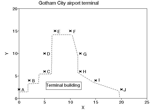 One point to note about the above picture is that we are not really interested in determining positions down to the nearest millimetre (the data is probably not accurate enough anyway!). Instead we are using the package to get an indication of the approximate region where it would be sensible to site a luggage pick-up point.