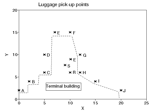 This is because as we do not yet know where the new facility (luggage pick-up point) is to be we cannot specify the distance between it and the gates without a general expression for calculating the distance between two locations. If (xi,yi) and (xj,yj) represent the coordinates of two locations i and j then the distance model measures can be: