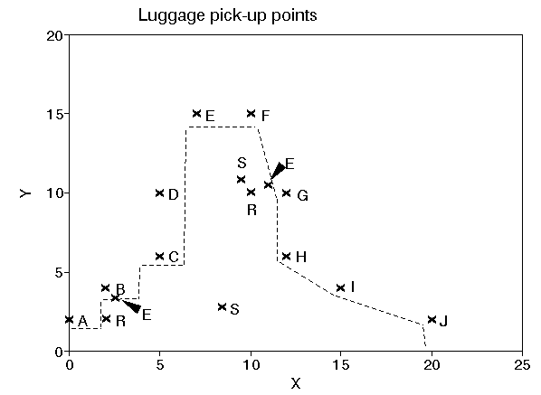 With this allocation decision made we can solve the problem using the package, the input being shown below. Note here that in this input we have made new facility number 1 the luggage pick-up point for gates C to H (inclusive) and new facility number 2 the luggage pick-up point for gates A, B, I and J.