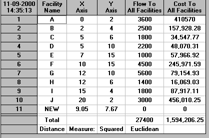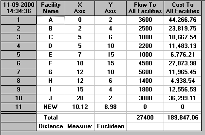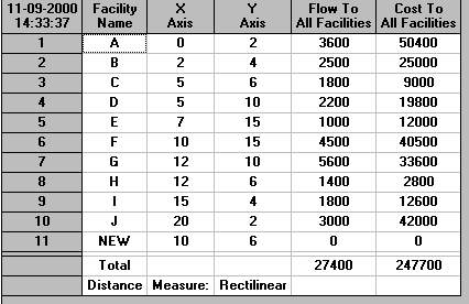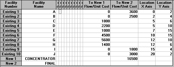 Note the cells associated with flows between New Facilities. This is for flows between new facilities, whose locations we do not yet know. For example, we could be moving luggage using a concentrator system. Luggage flows to a central point (new facility, a concentrator point) before being passed onward to a collection point (new facility). In such a case the flow from the concentrator point to the collection point would need to be given in this matrix.