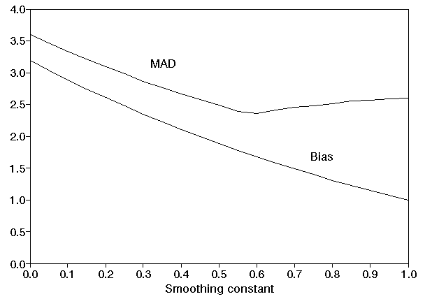 To illustrate the change in MAD, bias and MSD as µ changes we graph below MAD and bias against the smoothing constant µ,