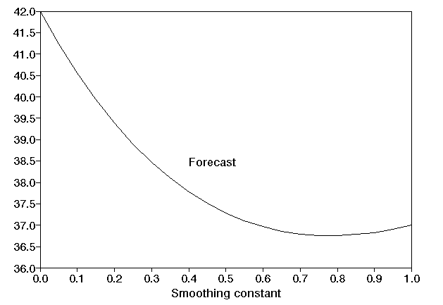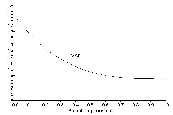 In fact methods are available which enable the optimal value of the smoothing constant (i.e. the value of µ which minimises the chosen criteria of forecast accuracy, such as mean squared deviation (MSD)) to be easily determined. This can be seen below where the package has calculated that the value of µ which minimises MSD is µ=0.86 (approximately).