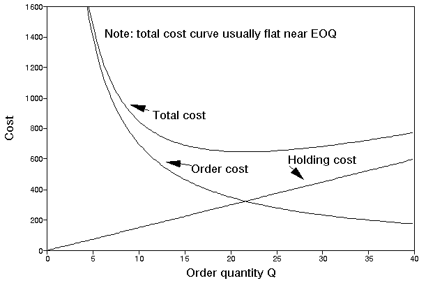The diagram below illustrates how these two components (annual holding cost and annual order cost) change as Q, the quantity ordered, changes. As Q increases holding cost increases but order cost decreases. Hence the total annual cost curve is as shown below - somewhere on that curve lies a value of Q that corresponds to the minimum total cost.