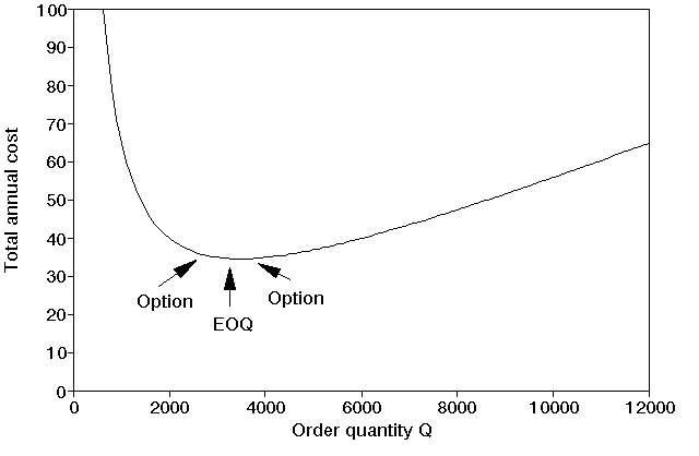 In fact we need not have examined all the options. As we knew that the EOQ was 3464 (associated with the minimum total annual cost) we have that the least cost option must be one of the two options that have order quantities nearest to 3464 (one order quantity above 3464, the other below 3464) i.e. either the 3-monthly (Q=3000) or the 4-monthly (Q=4000) options. This can be seen from the shape of the total annual cost curve shown below. The total annual cost for these two options could then be calculated to find which was the cheapest option.